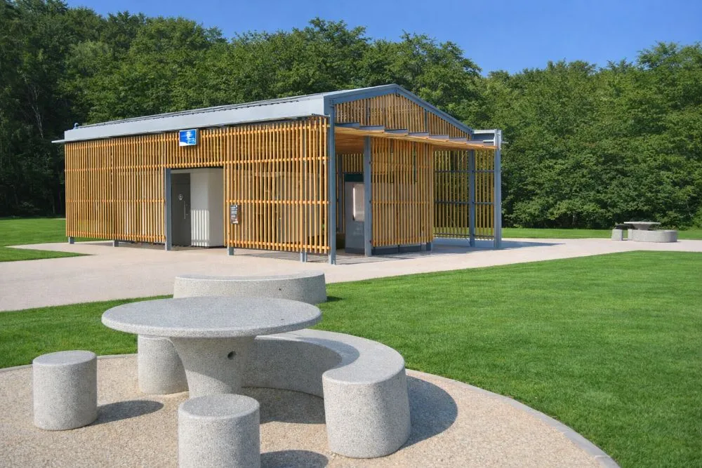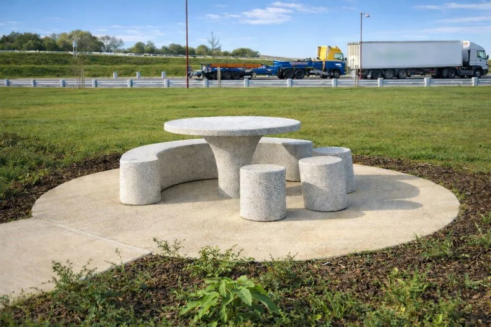 Réalisée sur mesure à la demande du réseau SANEF, cette table pique-nique en béton s’inscrit dans une démarche d’aménagement extérieur durable, pensée pour offrir aux usagers un espace de pause convivial, robuste et parfaitement intégré à son environnement. Conçue pour répondre aux contraintes d’un site très fréquenté, elle illustre notre savoir-faire dans la fabrication de mobilier en béton sur mesure destiné aux aires de repos et aux espaces extérieurs.